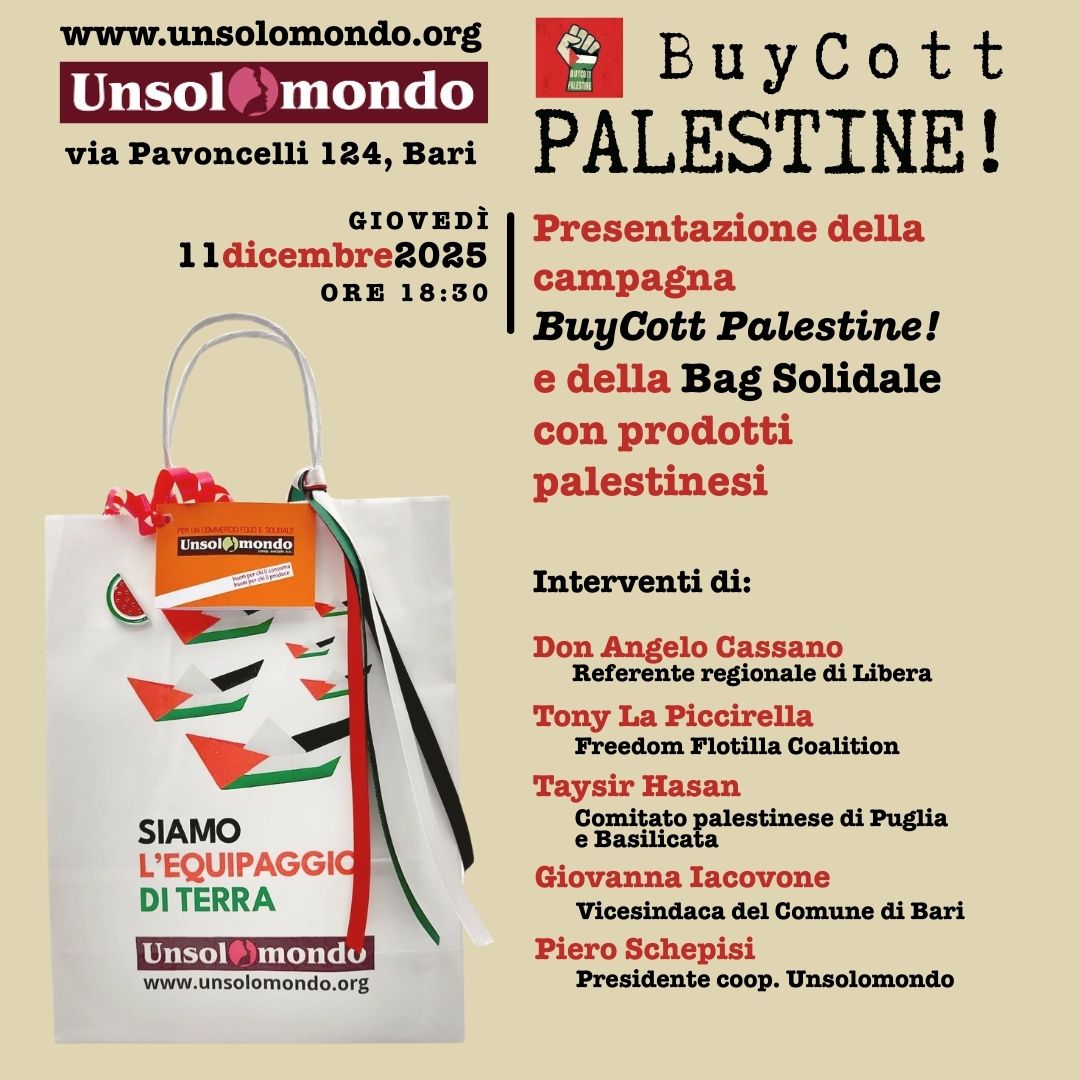 Giovedì 11 dicembre 2025 alle ore 18:30, la Cooperativa Unsolomondo ospita a Bari, in Via Pavoncelli 124, la presentazione della campagna BuyCott Palestine! con esperienze e voci dalla Palestina e da iniziative di giustizia sociale. Durante l’incontro sarà presentato anche il progetto Bag Solidale a sostegno della popolazione palestinese.